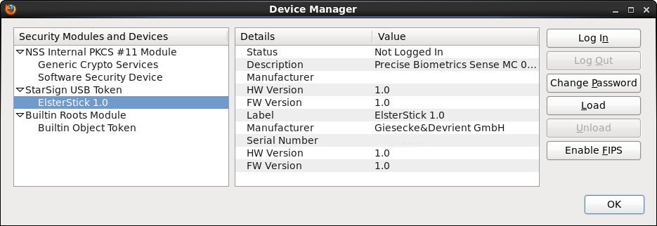 certutil -L -h “StarSign USB Token” -d ~/.mozilla/firefox/*.default, but requires the packagelibnss3-tools. The cryptographic modules should then be shown as for example in this figure.